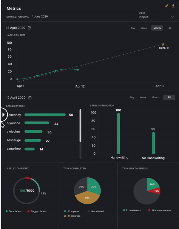 Labeling mass amounts of data can be an arduous task. We needed a way to incorporate delight into this process and received feedback from users that they would love to see how their metrics stacked up against their co-workers. The gamification feature was built out in a way that inspired users to continue labeling by adding competition: