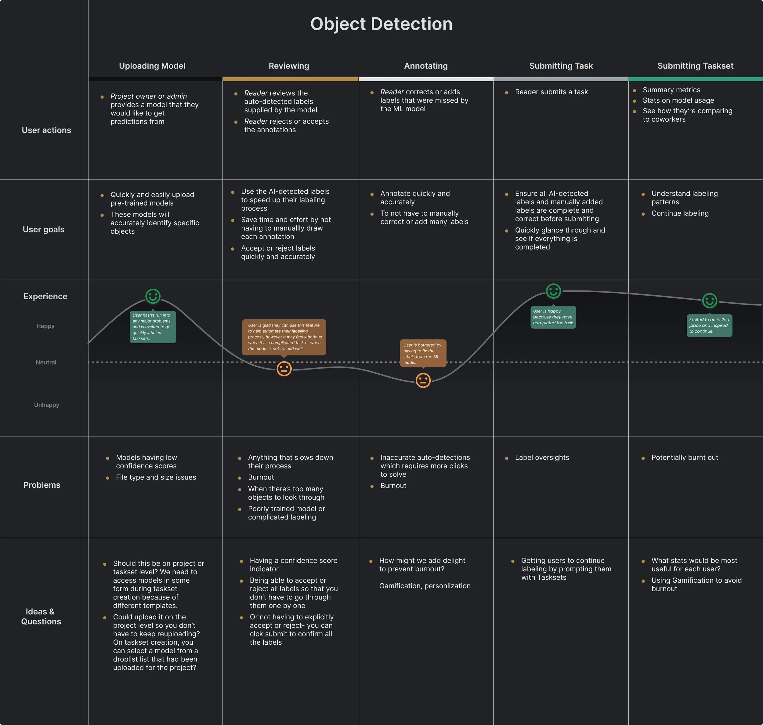 For our more complex features like Model Validation and Object Detection, we created user journey maps to visualize the exact steps and experiences a user would go through. It helped us hone in on their journey and refine specific aspects of their experience.