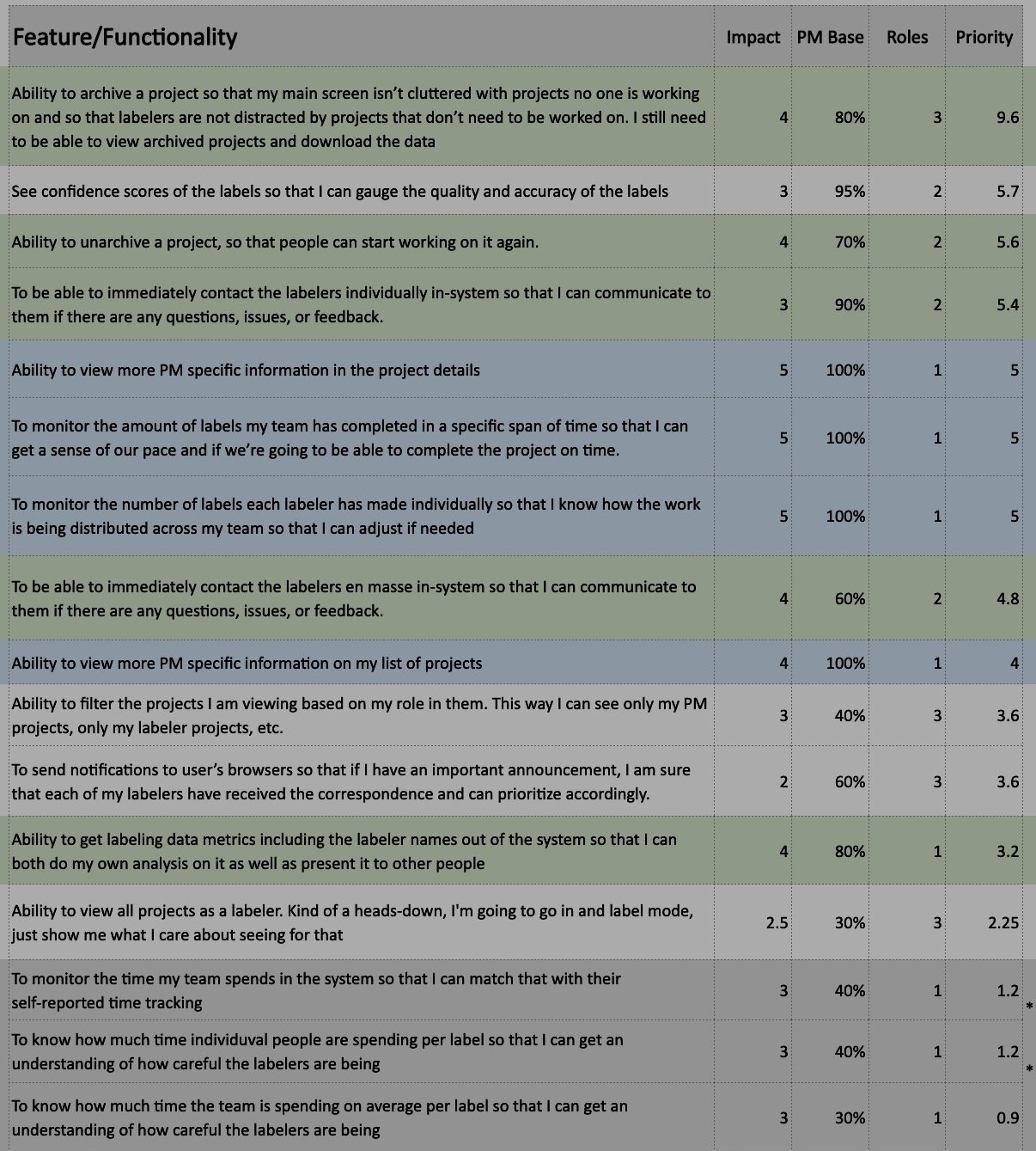 We created a feature prioritization list that included the feature/functionality in question, an impact score, the percentage of users the feature would affect, the number of user roles it would affect.