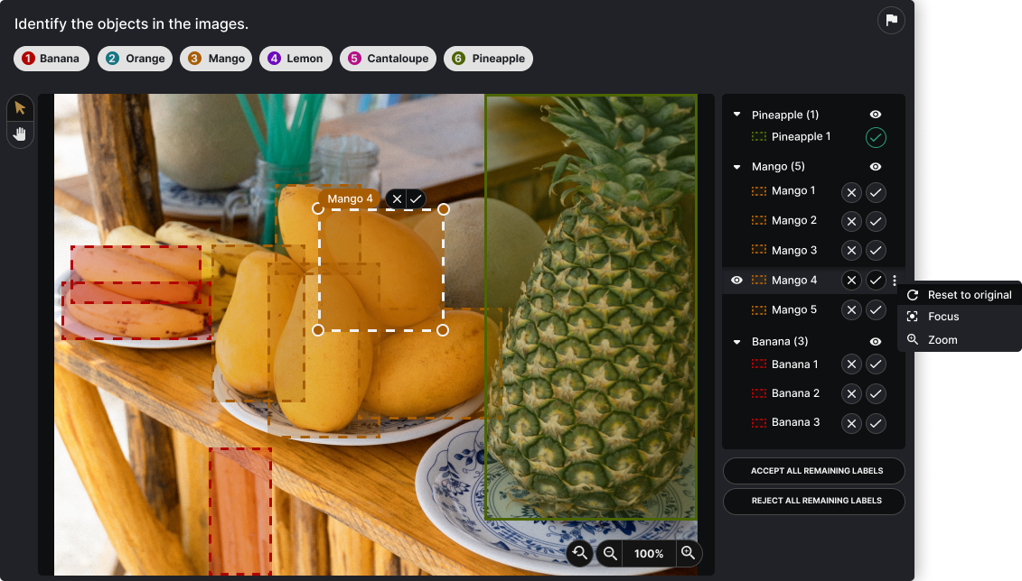 Further along in development, we designed a way for users to Accept or Reject Computer Vision AI automated labels. We researched and implemented Layer Contols, Hover States, and a way to mass Accept or Reject labels.