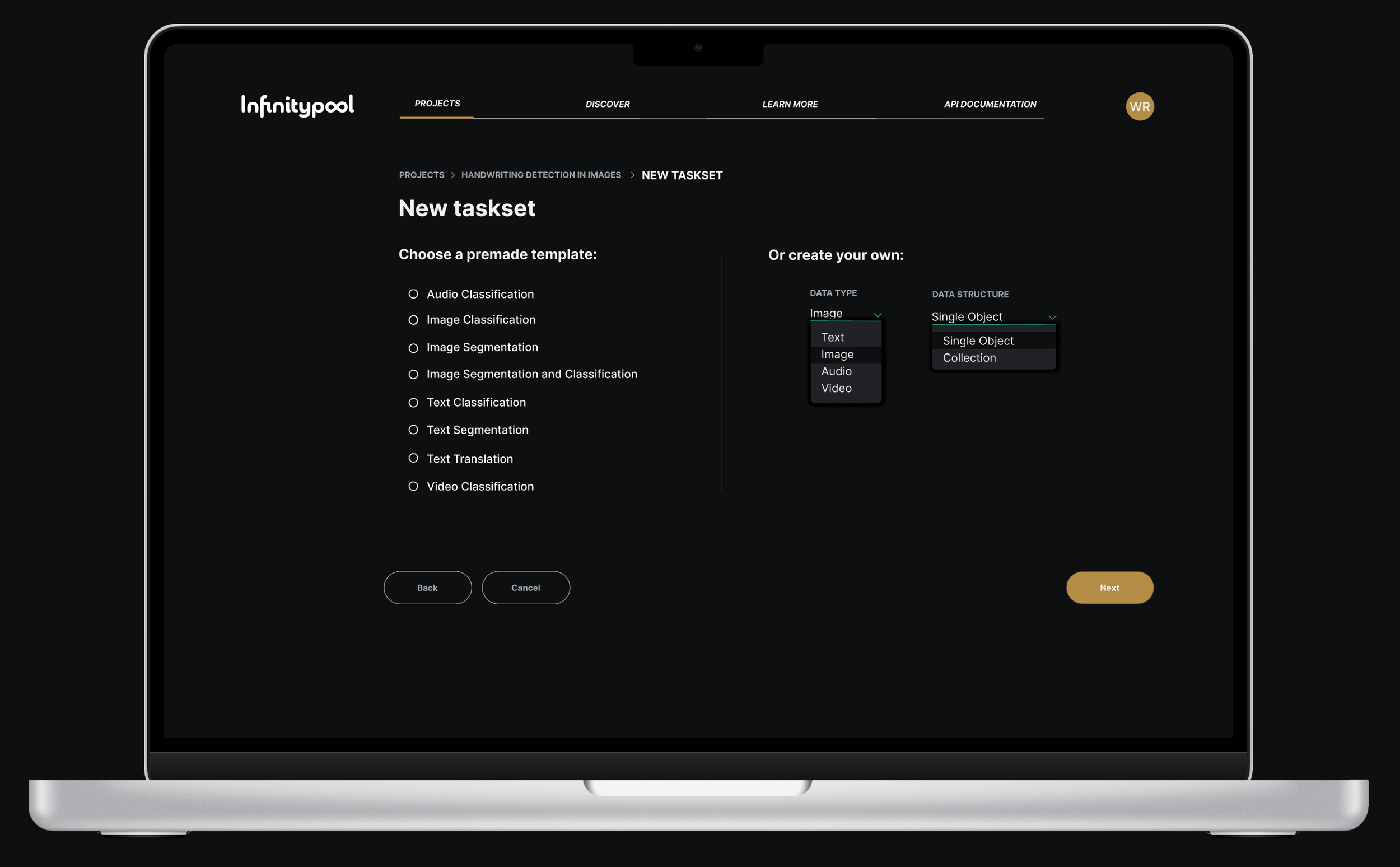 To compete, Infinitypool needed industry standard data-labeling templates. To gain an edge over the competition, Infinitypool needed to be the best at each of these types of labeling. We compiled a comprehensive list of standard templates and also provided users with options to customize their own and combine various types of data types and structures:
