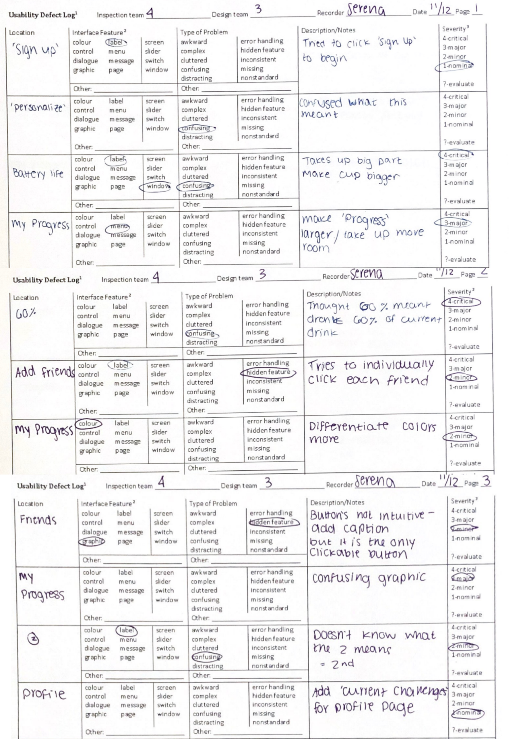 In order to record usability issues with our initial paper prototypes, we used the following Usability Defect Log. This was a quick and efficient way to record the location, which interface feature, type, and severity of each usability issue that users had.
