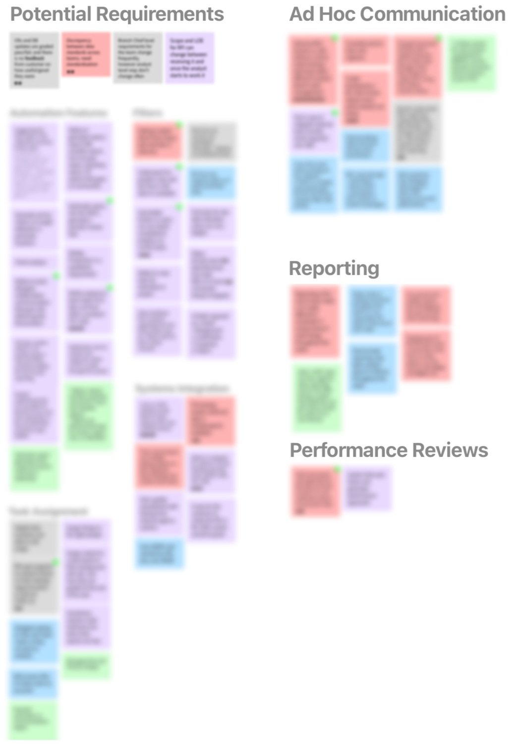 After interviewing several users in each user group, I took insights from each interview and organized them on colored '‘sticky notes” that each have a theme themselves. I then clustered notes that had insights into similar features. Finally, I named each cluster to identify a theme.