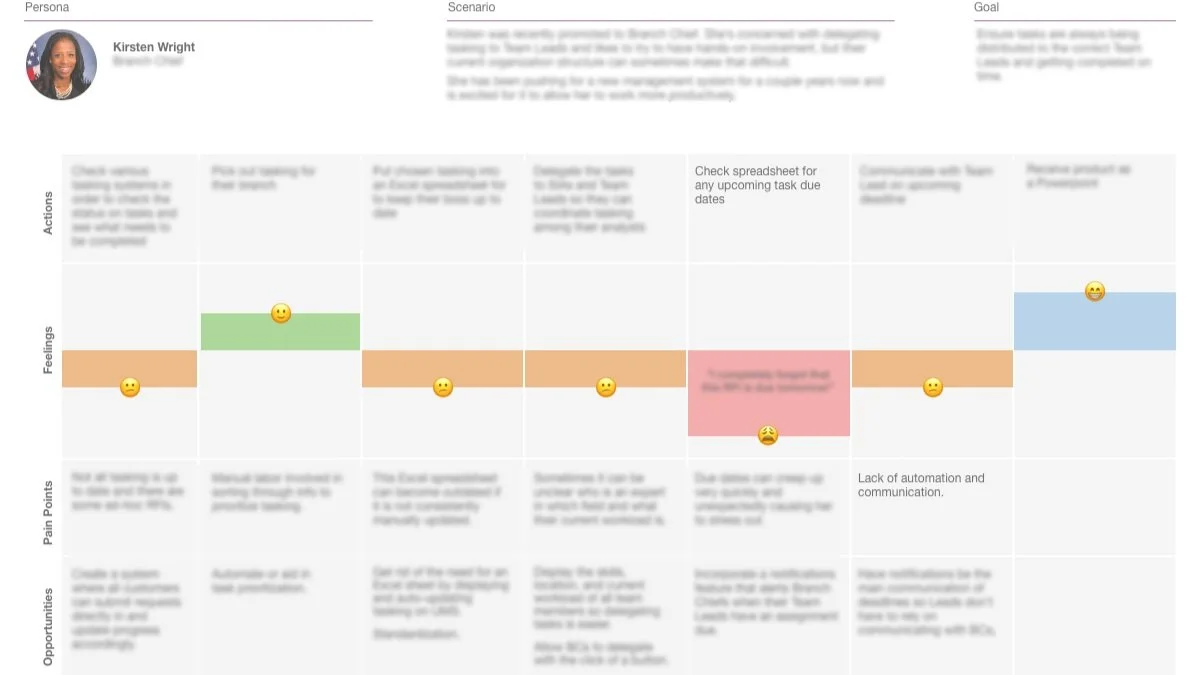 Since we have multiple users, and each one has a different role, I thought it would be beneficial to create a journey map for each Persona to illustrate an example of their potential actions, feelings, struggles, and opportunities as they move through the application.