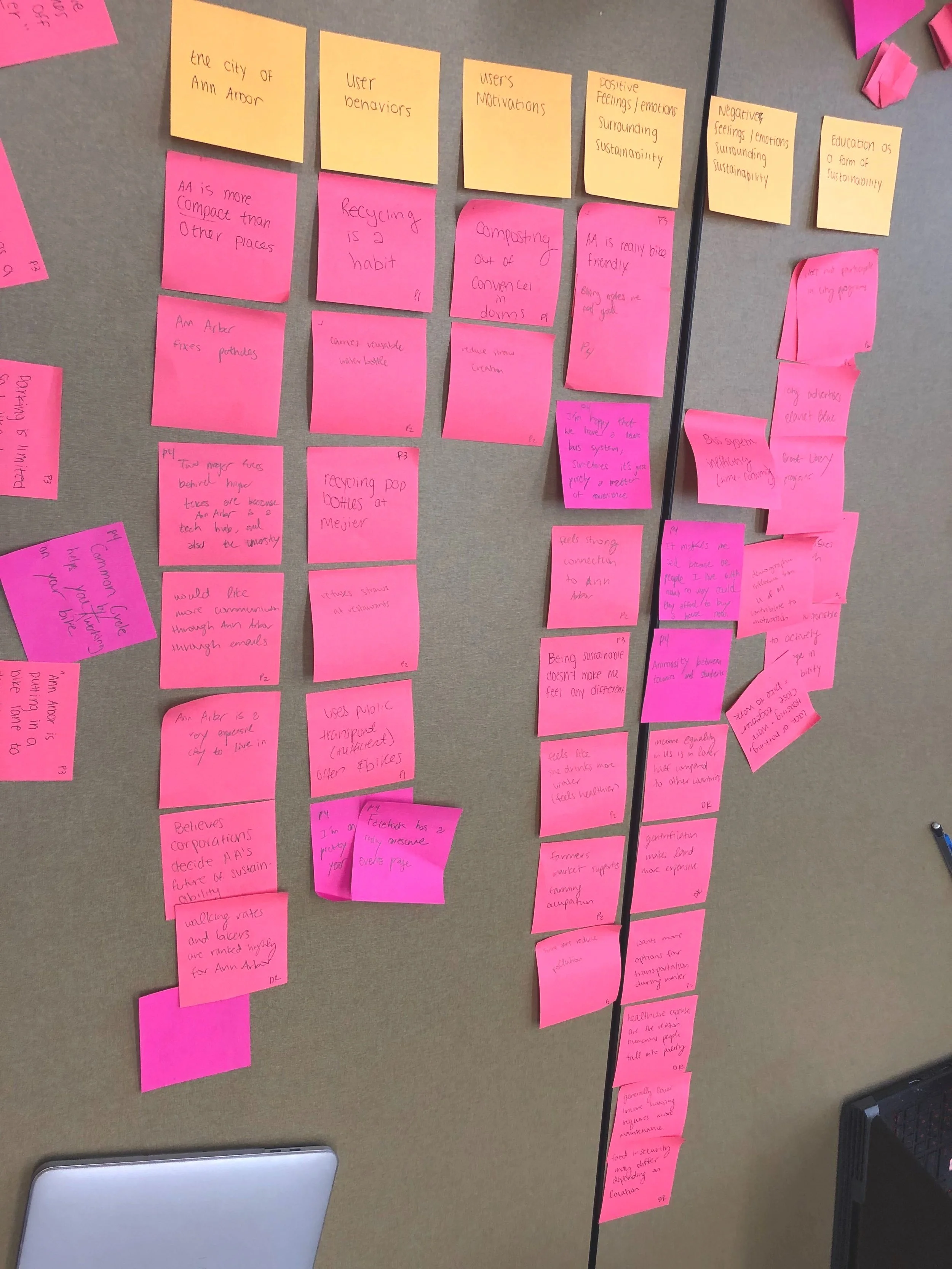 Insights from user interviews and desk research were used to find common connections, patterns, and themes. This information was documented on colored sticky notes and organized into themed clusters. This affinity map allowed us to view the large amount of information we collected sorted into a digestible and organized format.